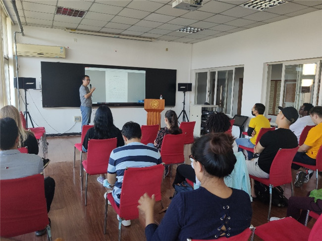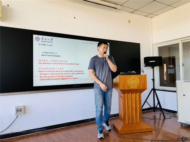 天津市公安局出入境管理局刘倩妤警官,就在华法律法规为新生提供解答。学校保卫处干部通过校园安全常识及真实案例讲解,向在场的国际学生讲述了英国上市365平台的校园安全知识;教务处、研工部老师分别对英国上市365平台本科生、研究生学则进行了讲解;党委学工部学生心理健康中心老师与国际学生分享了如何克服应对在华在校期间,因文化差异、环境不适、学习压力等产生一定的心理问题,并提供了学校学生心理健康中心等有效求助途径;党委宣传部干部与校史宣讲团成员以轻松愉悦的方式向国际学生讲述了南开的百年校史;国际学术交流处副处长欧迎希以“和新生谈谈心”为主题,从语言、融入、学习和未来四个角度与学生交流,帮助学生尽快适应学校生活。欧迎希还就防疫工作进行动员,希望同学们在防疫常态化工作期间,遵守防疫规定,避免跨城市、地区的外出,尽量避免人多的场所,进出校园提前申请。